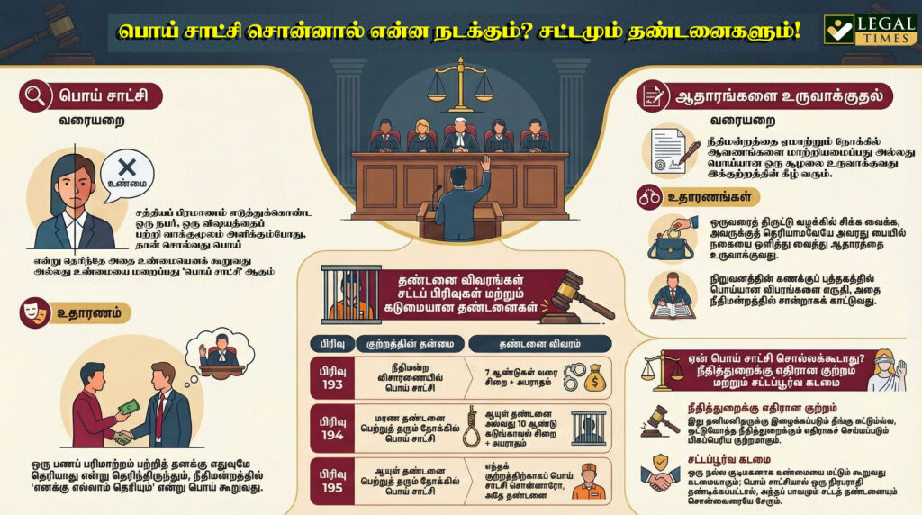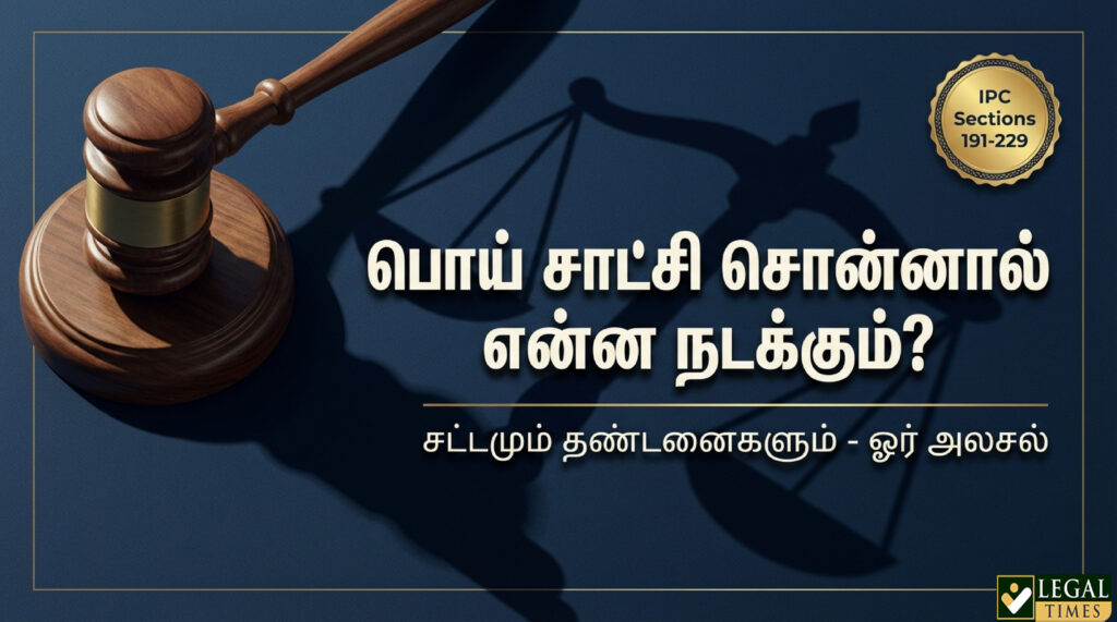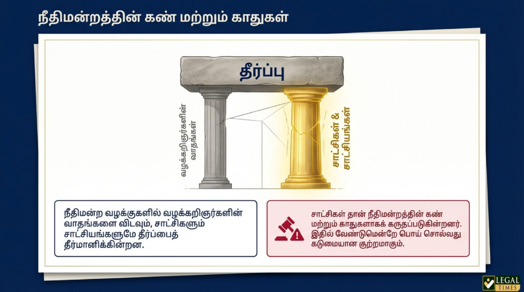 நீதிமன்ற வழக்குகளில் வழக்கறிஞர்களின் வாதங்களை விடவும், சாட்சிகளும் (Witnesses) சாட்சியங்களுமே (Exhibits) தீர்ப்பைத் தீர்மானிக்கின்றன. சாட்சிகள் தான் நீதிமன்றத்தின் கண் மற்றும் காதுகளாகக் கருதப்படுகின்றனர். ஆனால், நீதிமன்றத்தில் ஒருவர் வேண்டுமென்றே பொய் சாட்சி சொன்னால், அது கடுமையான குற்றமாகக் கருதப்படுகிறது. இது குறித்து இந்திய தண்டனைச் சட்டம் (IPC) பிரிவு 191 முதல் 229 வரை விரிவாகக் கூறப்பட்டுள்ளது.
