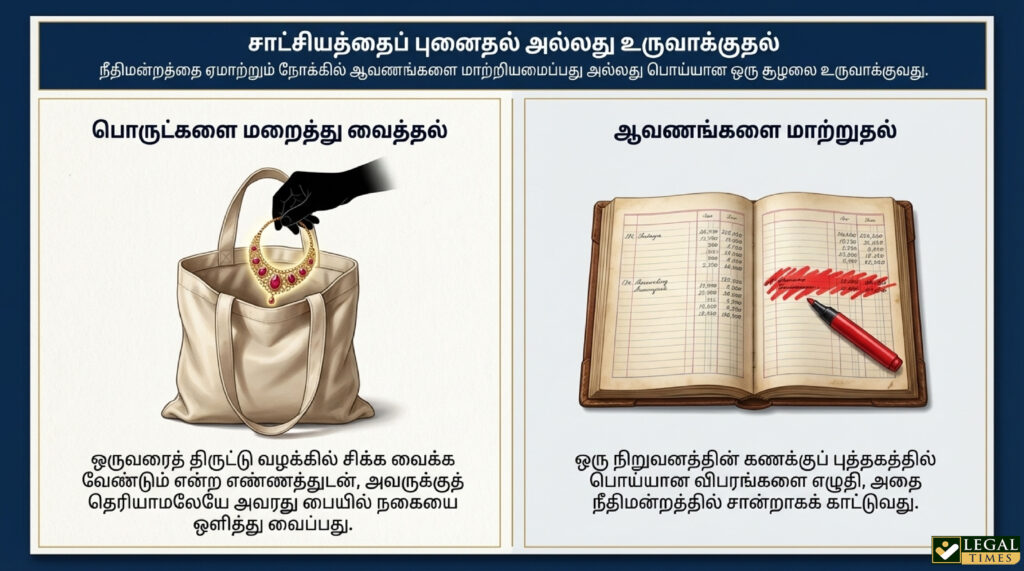 உதாரணம் 1: ஒருவரைத் திருட்டு வழக்கில் சிக்க வைக்க வேண்டும் என்ற எண்ணத்துடன், அவருக்குத் தெரியாமலேயே அவரது பையில் நகையை ஒளித்து வைப்பது சாட்சியத்தைப் புனைவதாகும்.