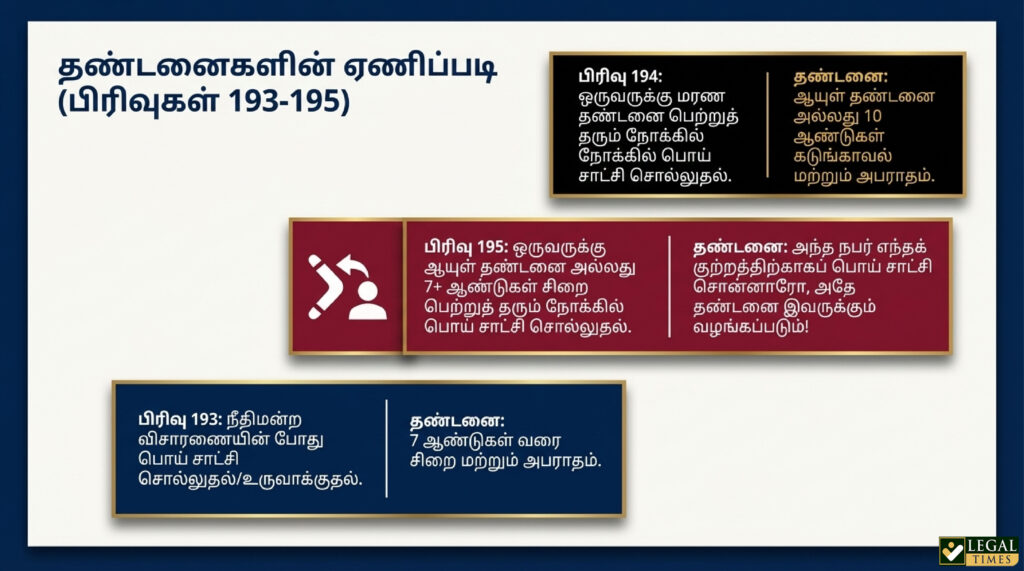 | பிரிவு 195 | ஒருவருக்கு ஆயுள் தண்டனை அல்லது 7 ஆண்டுகளுக்கு மேல் சிறை பெற்றுத் தரும் நோக்கில் பொய் சாட்சி சொல்லுதல். | அந்த நபர் எந்தக் குற்றத்திற்காகப் பொய் சாட்சி சொன்னாரோ, அதே தண்டனை இவருக்கும் வழங்கப்படும். |