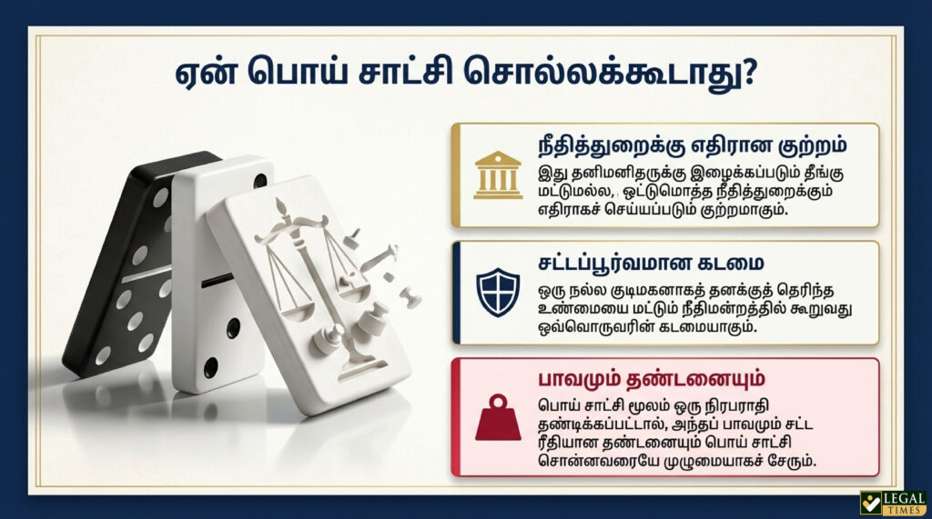 நீதிமன்றத்தில் பொய் சாட்சி சொல்வது என்பது தனிமனிதருக்கு இழைக்கப்படும் தீங்கு மட்டுமல்ல, அது ஒட்டுமொத்த நீதித்துறைக்கும் எதிராக செய்யப்படும் குற்றமாகும். ஒரு நல்ல குடிமகனாக தனக்கு தெரிந்த உண்மையை மட்டும் நீதிமன்றத்தில் கூறுவது சட்டப்பூர்வமான கடமையாகும். பொய் சாட்சி மூலம் ஒரு நிரபராதி தண்டிக்கப்பட்டால், அந்தப் பாவமும் சட்ட ரீதியான தண்டனையும் பொய் சாட்சி சொன்னவரையே சேரும்.