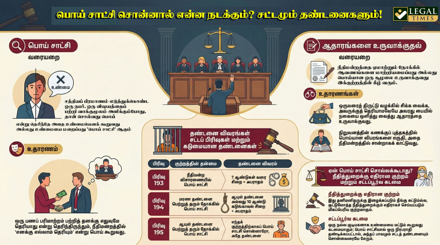 | பிரிவு 193 | நீதிமன்ற விசாரணையின் போது பொய் சாட்சி சொல்லுதல் அல்லது உருவாக்குதல். | 7 ஆண்டுகள் வரை சிறை தண்டனை மற்றும் அபராதம். |