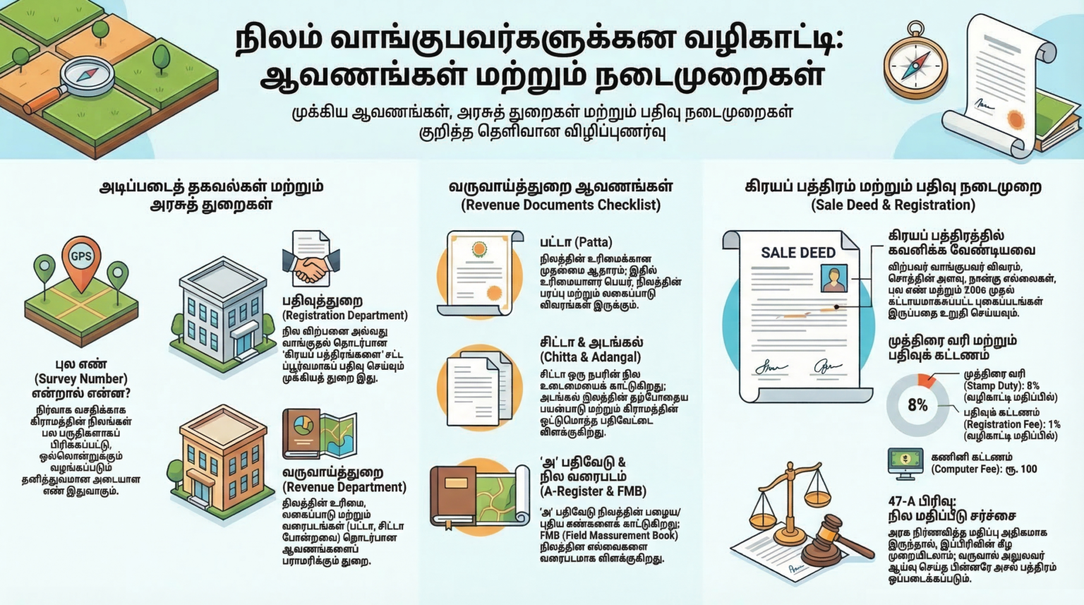 • முத்திரைத் தீர்வை (Stamp Duty): வழிகாட்டி மதிப்பில் 8% முத்திரைத் தாள்களாக செலுத்த வேண்டும் (தற்போது சில மாற்றங்கள் இருக்கலாம்).