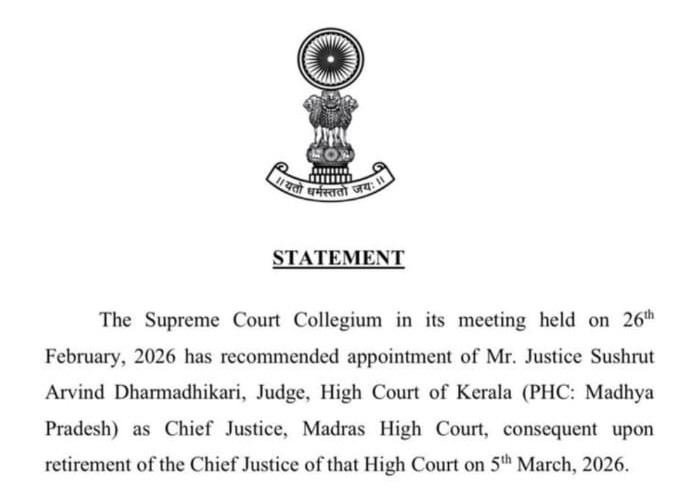 கடந்த 2025ஆம் ஆண்டு ஏப்ரல் மாதம் கேரள உயர் நீதிமன்றத்திற்கு இடமாற்றம் செய்யப்பட்ட நீதிபதியாக சுஷ்ருத் அரவிந்த் தர்மாதிகாரியை, சென்னை உயர் நீதிமன்றத்தின் அடுத்த தலைமை நீதிபதியாக நியமிக்க உச்ச நீதிமன்ற கொலிஜியம் தற்போது பரிந்துரை செய்துள்ளது.