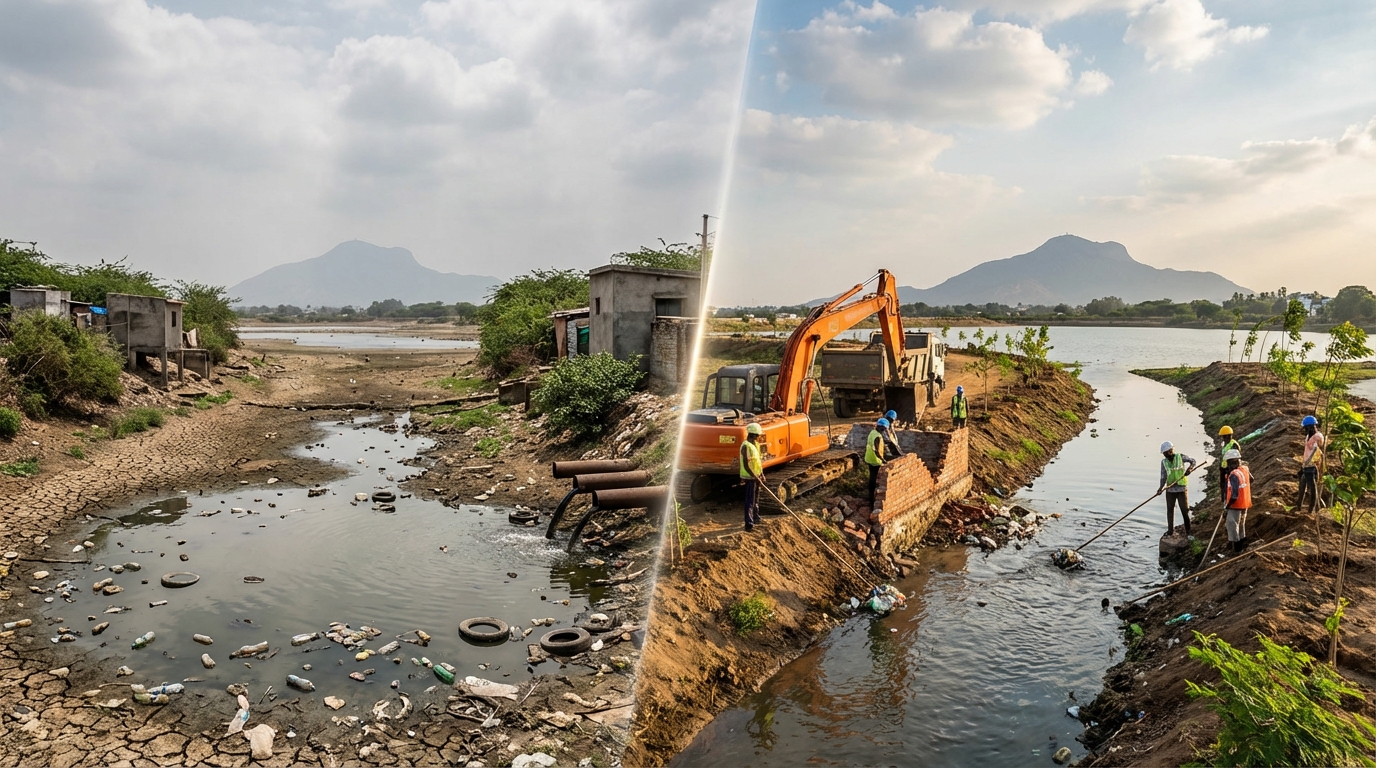 மதுரை ஒத்தக்கடை அருகே உள்ள வரலாற்று சிறப்புமிக்க ராஜகம்பீரம் கண்மாய் மற்றும் அதன் நீர்வரத்து கால்வாய்களைப் பாதுகாக்கக் கோரிய வழக்கில், ஆக்கிரமிப்புகளை அகற்றவும், கழிவுநீர் கலப்பதைத் தடுக்கவும் சென்னை உயர் நீதிமன்ற மதுரை கிளை அதிரடி உத்தரவுகளைப் பிறப்பித்துள்ளது.